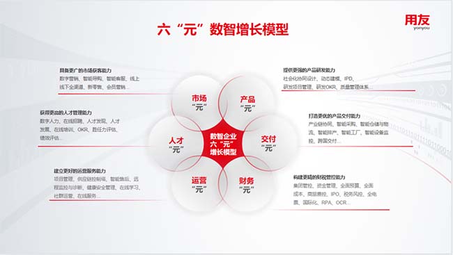 基于對典型客戶的分析,結合知名管理理論和過往實踐,用友將成長型企業(yè)經(jīng)營管理的基本要素進一步抽象,以“元”為初始,重磅推出了全新的企業(yè)價值模型,即六“元”數(shù)智增長模型。