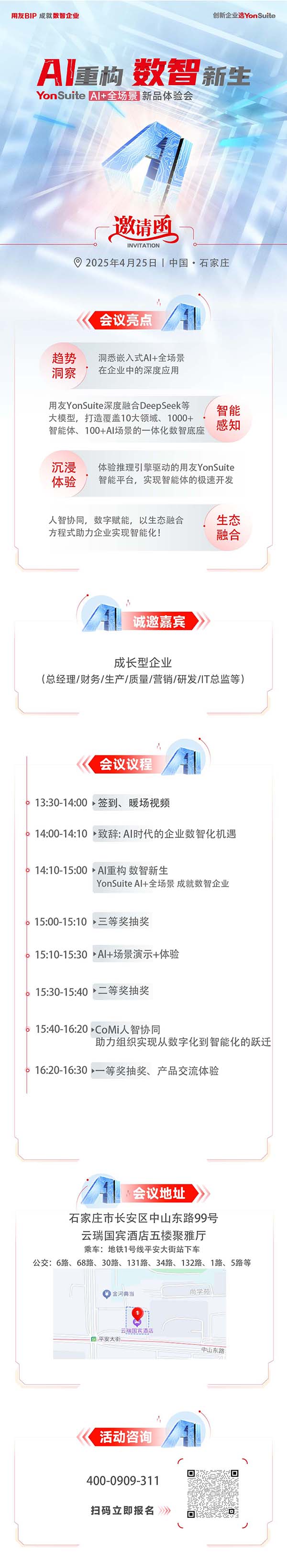 免費AI盛宴,智啟未來!4.25日云瑞國賓酒店-河北鴻圖YonSuite峰會免費邀約