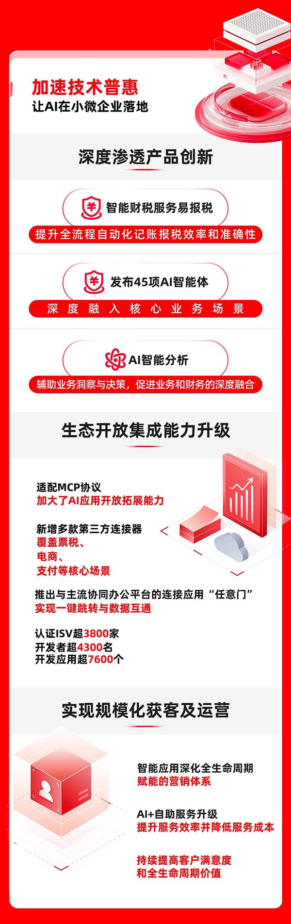 報告期內(nèi),暢捷通加速推動AI技術(shù)在小微企業(yè)的深度落地,通過新一代企業(yè)級AI原生應(yīng)用開發(fā)平臺,不斷優(yōu)化產(chǎn)品體驗(yàn)與效能。為微型企業(yè)提供全流程智能化記賬報稅的智能財(cái)稅服務(wù)易報稅,借助于AI技術(shù)的發(fā)展和對財(cái)稅垂直大模型的持續(xù)訓(xùn)練,效率及準(zhǔn)確性進(jìn)一步提升,同時開啟高效業(yè)務(wù)拓展模式,為該業(yè)務(wù)的規(guī)?;茝V打下堅(jiān)實(shí)基礎(chǔ)。暢捷通還發(fā)布了45項(xiàng)AI智能體應(yīng)用,覆蓋多條產(chǎn)品線,深度融入核心業(yè)務(wù)場景,全方位提升企業(yè)經(jīng)營效率。