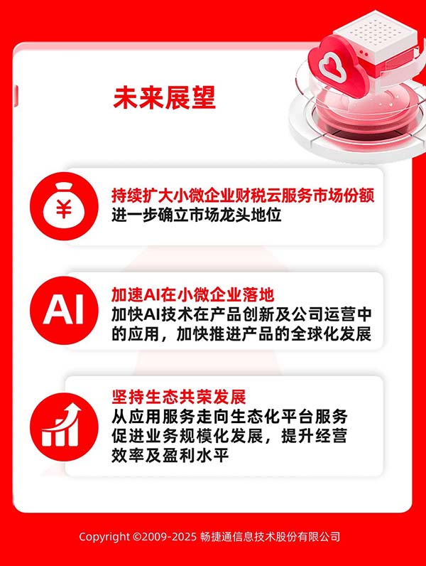 未來,暢捷通將持續(xù)擴(kuò)大小微企業(yè)財(cái)稅云服務(wù)市場份額,進(jìn)一步鞏固小微企業(yè)財(cái)稅云服務(wù)市場龍頭地位,搶占小微企業(yè)云服務(wù)市場龍頭地位,堅(jiān)定秉持客戶成功原則,持續(xù)提升產(chǎn)品競爭力,加快推進(jìn)產(chǎn)品的全球化發(fā)展。與此同時,暢捷通將加速AI在小微企業(yè)落地,加快AI技術(shù)在產(chǎn)品創(chuàng)新及公司運(yùn)營中的應(yīng)用,堅(jiān)持生態(tài)共榮發(fā)展,從應(yīng)用服務(wù)走向生態(tài)化平臺服務(wù),促進(jìn)業(yè)務(wù)規(guī)模化發(fā)展,提升經(jīng)營效率及盈利水平。