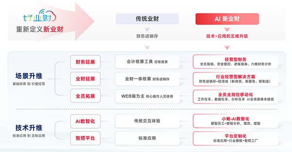 值此關(guān)鍵節(jié)點(diǎn),暢捷通發(fā)布好業(yè)財(cái)AI新業(yè)財(cái),通過(guò)“技術(shù)+應(yīng)用”的五維升級(jí),開(kāi)啟從“傳統(tǒng)業(yè)財(cái)”到“AI新業(yè)財(cái)”的深刻變革,重新定義財(cái)務(wù)進(jìn)銷存,賦能企業(yè)邁向智慧經(jīng)營(yíng)新紀(jì)元。