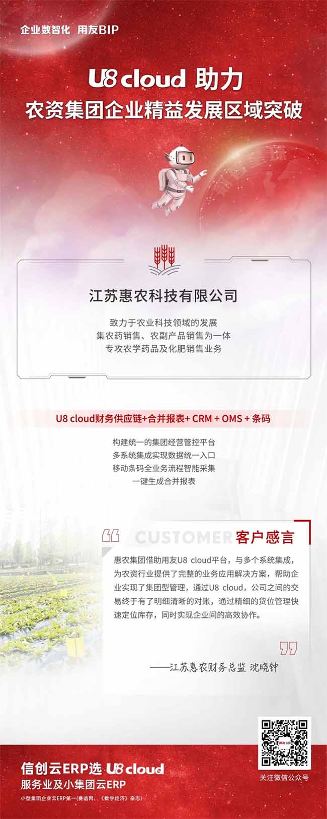 “惠農(nóng)ERP數(shù)智信息化”項(xiàng)目從規(guī)劃到建設(shè),用友U8 cloud僅用了半年時(shí)間實(shí)現(xiàn)了ERP和 CRM雙系統(tǒng)上線,ERP與OMS系統(tǒng)和條碼系統(tǒng)的集成管理, 對(duì)處于企業(yè)信息化管理階段的江蘇惠農(nóng)和類似農(nóng)資行業(yè)客戶探索數(shù)智化,更具有非凡的里程碑意義和參考價(jià)值。