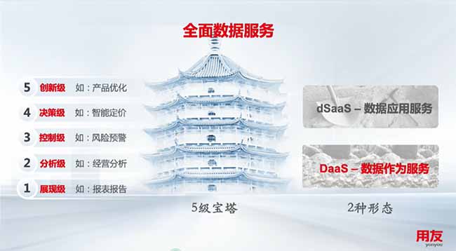綜上,數(shù)據(jù)服務(wù)的“五級(jí)寶塔”,構(gòu)成了企業(yè)數(shù)據(jù)服務(wù)的完整體系!這與數(shù)據(jù)分析領(lǐng)域的四層分析層次也是不謀而合,都是對(duì)于企業(yè)數(shù)據(jù)服務(wù)深度的一種分類(lèi)和表達(dá)。不同之處在于,用友提出數(shù)據(jù)服務(wù)“五級(jí)寶塔”模型,更側(cè)重于應(yīng)用場(chǎng)景層面,而數(shù)據(jù)分層的四個(gè)層次更側(cè)重于分析技術(shù)方面。